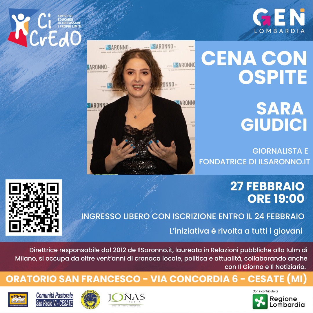 17 Febbraio 2026 / Ultimo aggiornamento : 17 Febbraio 2026 admin_oratori Ci CrEdo Cena con Ospite – Sara Giudici – 27/02/2026 ore 19.00 [featured_image] Download Versione Download 13 Dimensioni file 322 KB Conteggio file 1 Data di creazione 17 Febbraio 2026 Ultimo aggiornamento 17 Febbraio 2026 Cena con Ospite - Sara Giudici - 27/02/2026 ore 19.00